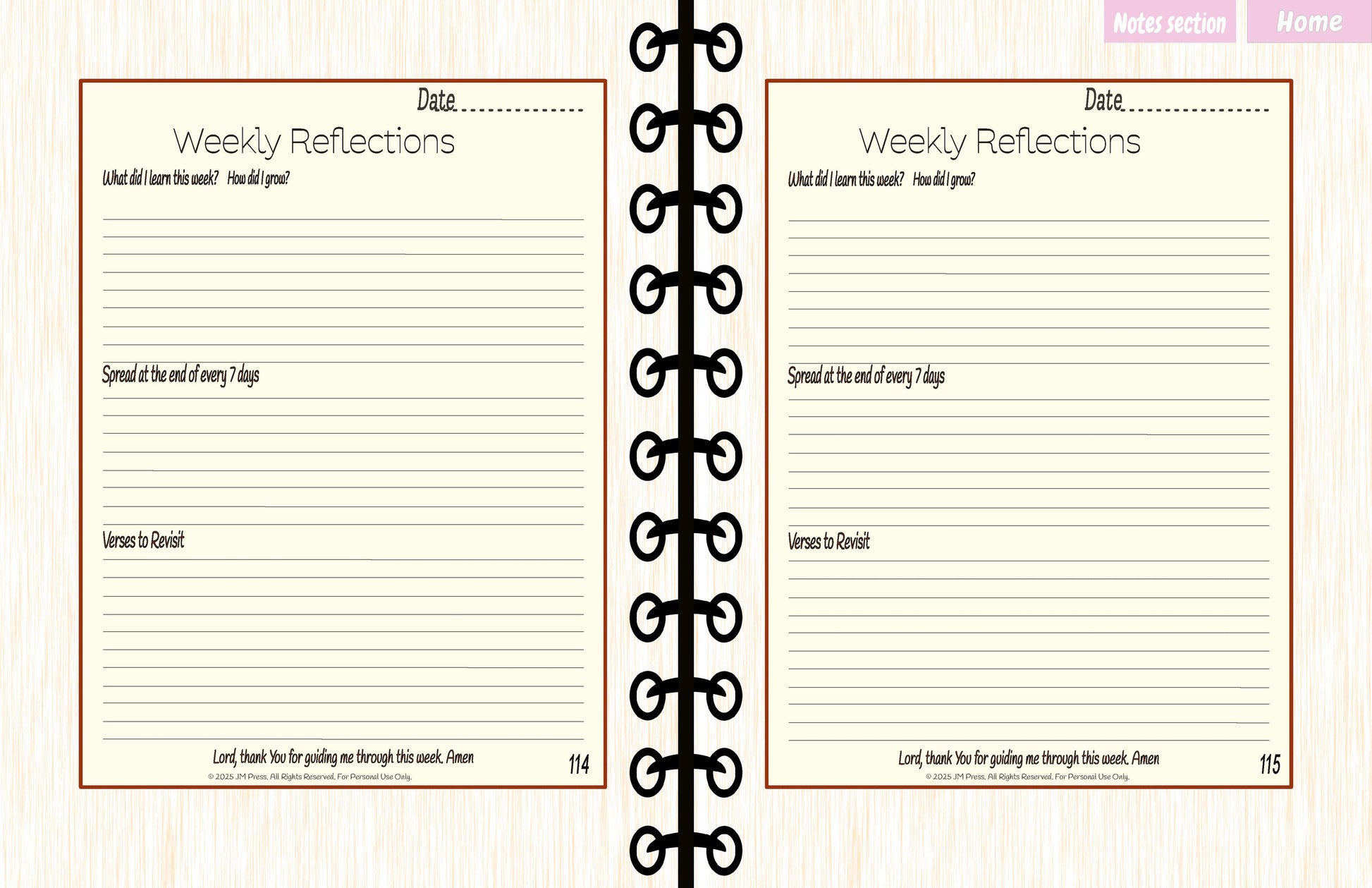 A 90-day daily devotion guide with weekly reflections. Perfect for consistent Bible study and scripture journaling.